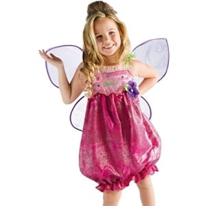 - Pink dress with bubble shaped bottom and purple fairy wings which attach with velcro